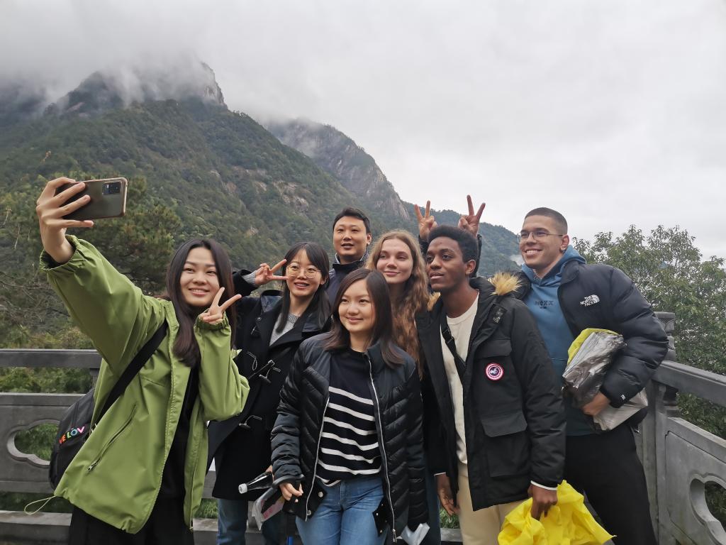 国际青年们在安徽黄山风景区合影留念(2023年11月11日摄)。新华社记者刘方强 摄