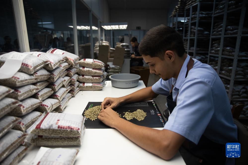 11月7日,在巴西东南部米纳斯吉拉斯州塞拉杜地区的一家咖啡种植者合作社里,工作人员在咖啡豆样本仓库里筛选咖啡豆。新华社记者 王天聪 摄