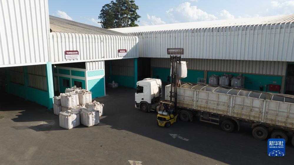 11月7日,在巴西东南部米纳斯吉拉斯州塞拉杜地区的一家咖啡种植者合作社里,工作人员将咖啡豆装车。新华社记者 王天聪 摄