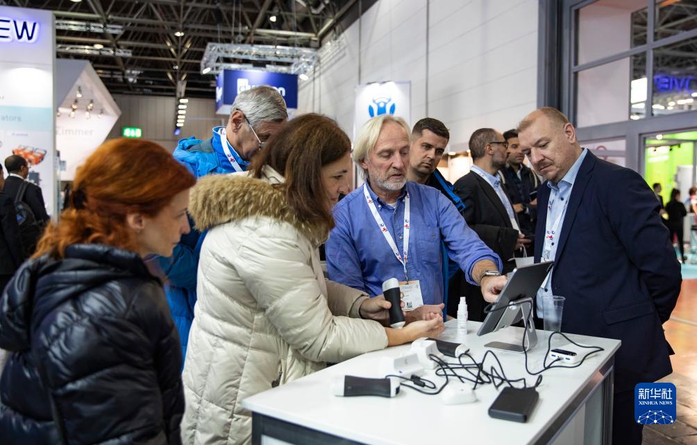 11月13日,在德国杜塞尔多夫国际医疗器械设备展,参观者在热景生物展位咨询洽谈。新华社记者 张帆 摄