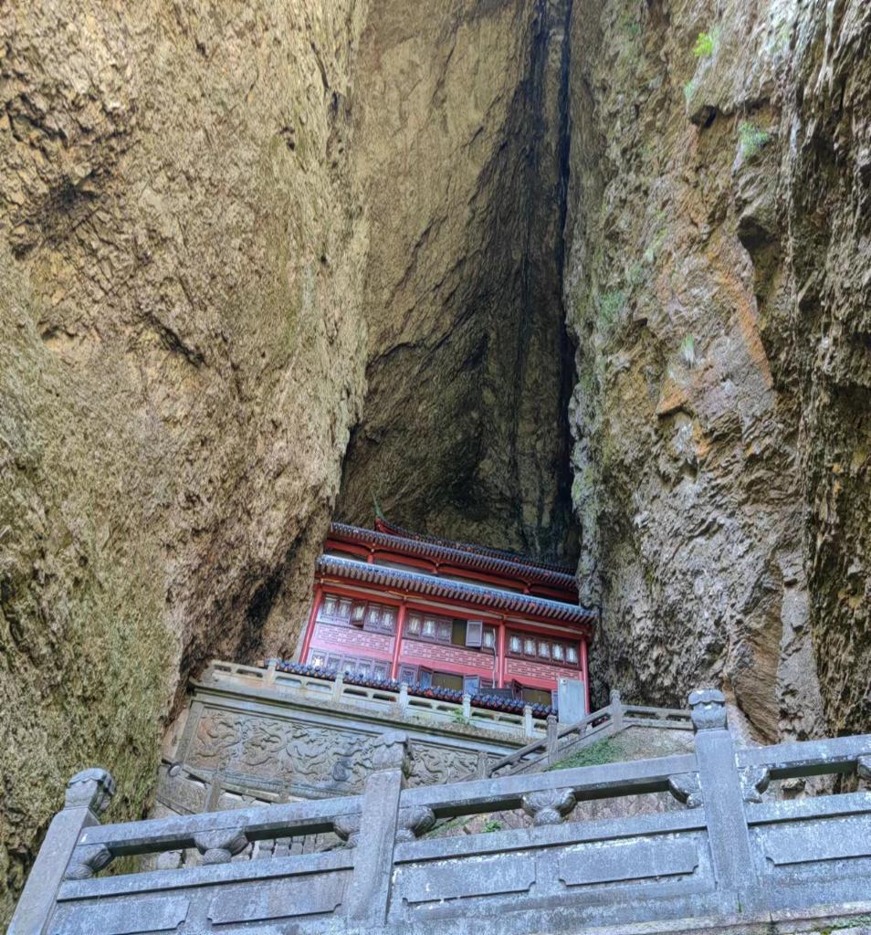 观音洞,又名罗汉洞,被称为“雁荡山第一洞天”。行至一座高270米的山峰脚下,可见两峰相依,两峰合在一起称为合掌峰。观音洞便藏在合掌峰中的裂缝之中,洞高113米,深76米,但宽仅14米。观音洞倚山而建,还有殿堂依岩构筑,共有九层楼阁,从山脚要经历400余级逶迤石磴,才达顶层大殿。这里曾是影视剧《神雕侠侣》重阳宫的取景地。