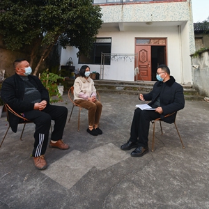 浙江省湖州市吴兴区道场乡老潘调解工作室的调解员潘水方(右)在钱山下村村民家中进行回访(2023年1月12日摄)。新华社记者 徐昱 摄
