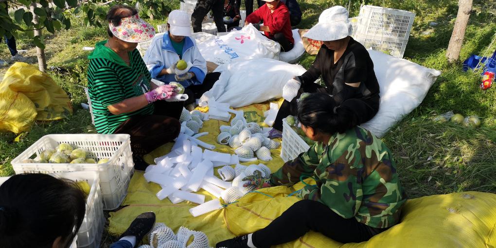 在山西省汾西县团柏乡的千亩梨园里,果农们分拣新采摘的玉露香梨。新华社记者王飞航 摄