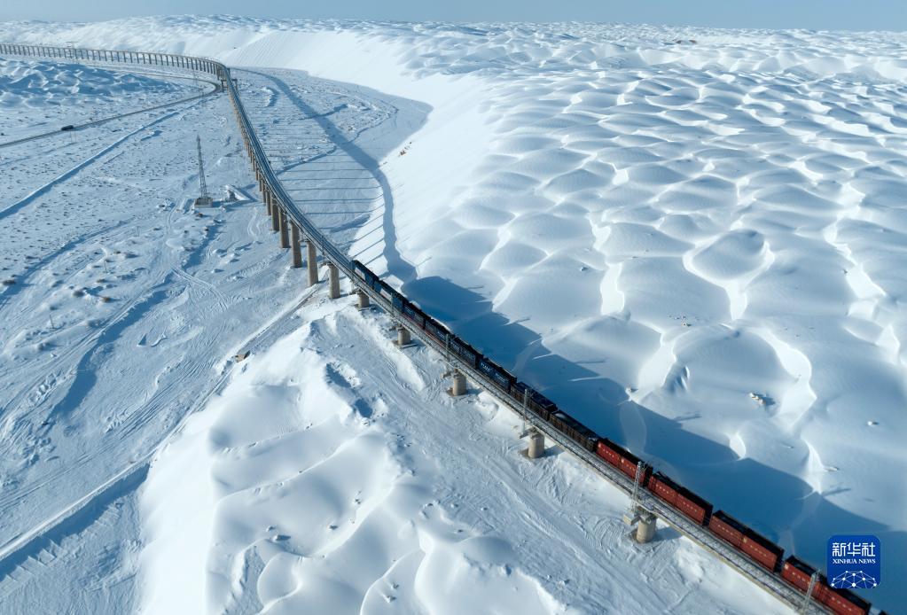 11月15日,在阿克塞县,一列火车在大漠中穿行(无人机照片)。