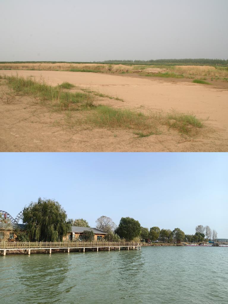这是一张拼版照片,上图为昔日的沉沙池。(受访单位供图);下图为如今的位山黄河公园,新华社记者张力元摄。