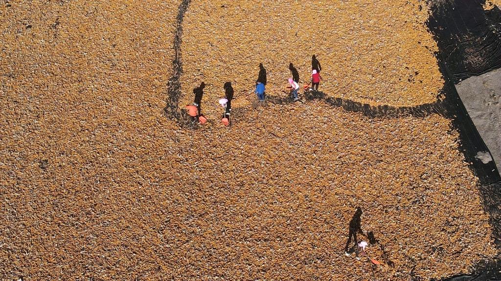 这是在张掖市临泽县倪家营镇一处晾晒场,群众正在晾晒制种玉米(无人机照片)。新华社记者 王朋 摄