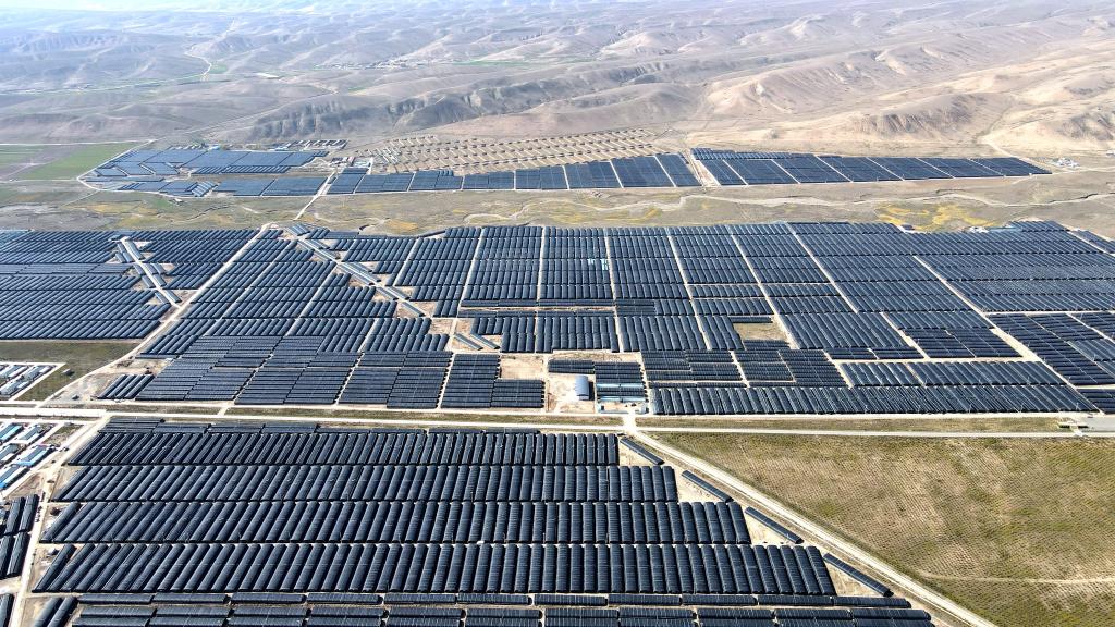 这是在天祝藏族自治县德吉新村的荒滩拍摄的日光温室(无人机照片)。新华社记者 王朋 摄