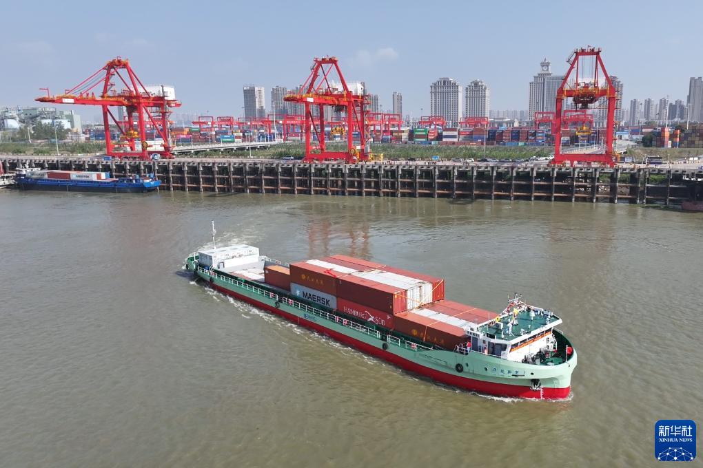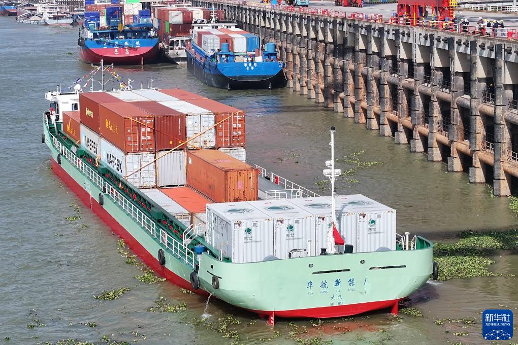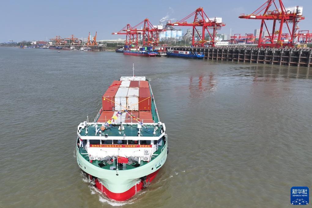 新华社武汉11月16日电(记者李思远、熊琦)没有柴油机隆隆轰鸣,没有烟囱冒出的缕缕黑烟,只在船尾设置4个箱式电源,120标箱纯电动集装箱船就能在长江和汉江破浪前行……16日,汉江首艘纯电动集装箱示范船“华航新能1”在湖北武汉首航,由此开启汉江航运的电化时代。