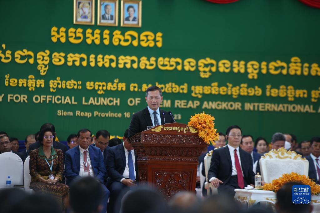 11月16日,柬埔寨首相洪玛奈在暹粒吴哥国际机场通航庆典上讲话。新华社发(李莱 摄)