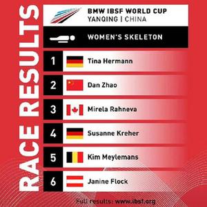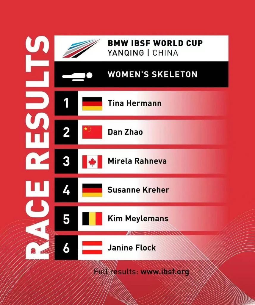 赵丹在首轮滑行中发挥出色,以1分01秒63的成绩排名第一,但第二轮1分02秒20的成绩仅排名第五。上赛季世界杯女子钢架雪车总冠军赫尔曼的首轮滑行落后赵丹0.12秒,但她在次轮滑出1分02秒06,最终凭借更加稳定的发挥摘得桂冠。另一位中国选手黎禹汐位列第七。