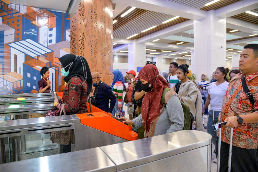11月17日,在印度尼西亚雅加达的雅万高铁哈利姆站候车大厅,人们刷票前往站台。新华社记者徐钦摄