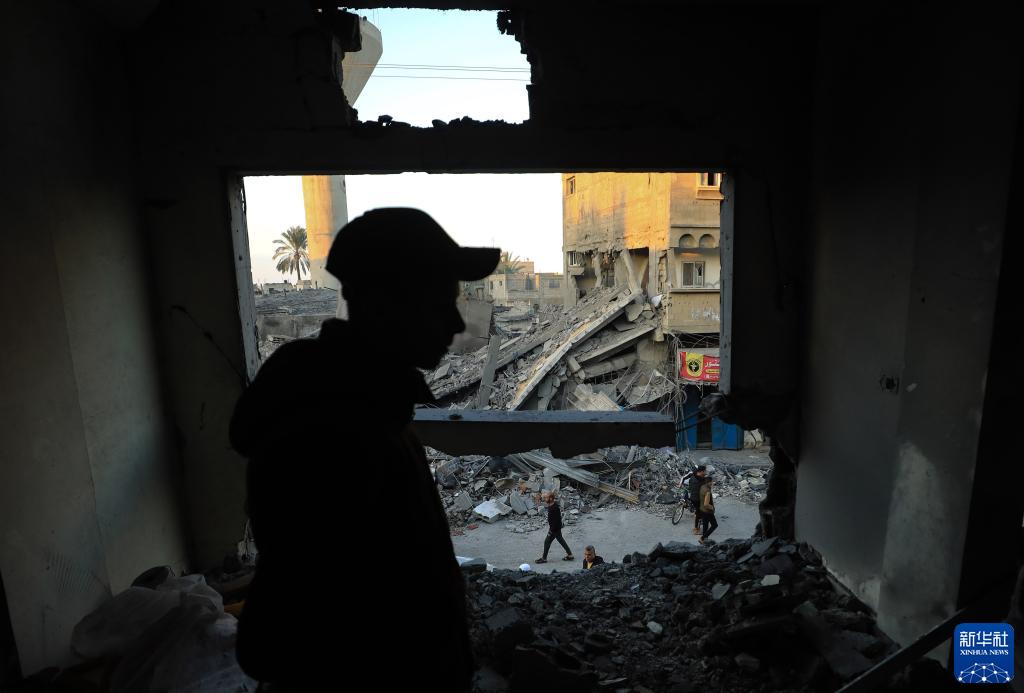 11月17日,在加沙地带南部城市汗尤尼斯,一名男子查看遭以色列袭击后的建筑废墟。