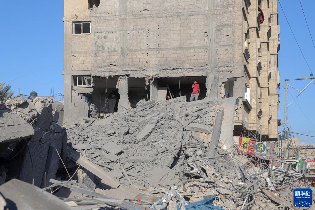 11月17日,在加沙地带南部城市汗尤尼斯,一名男子查看遭以色列袭击后的建筑废墟。