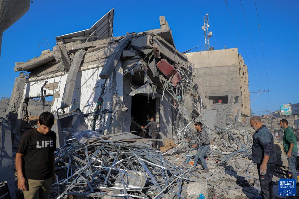 11月17日,在加沙地带南部城市汗尤尼斯,人们查看遭以色列袭击后的建筑废墟。