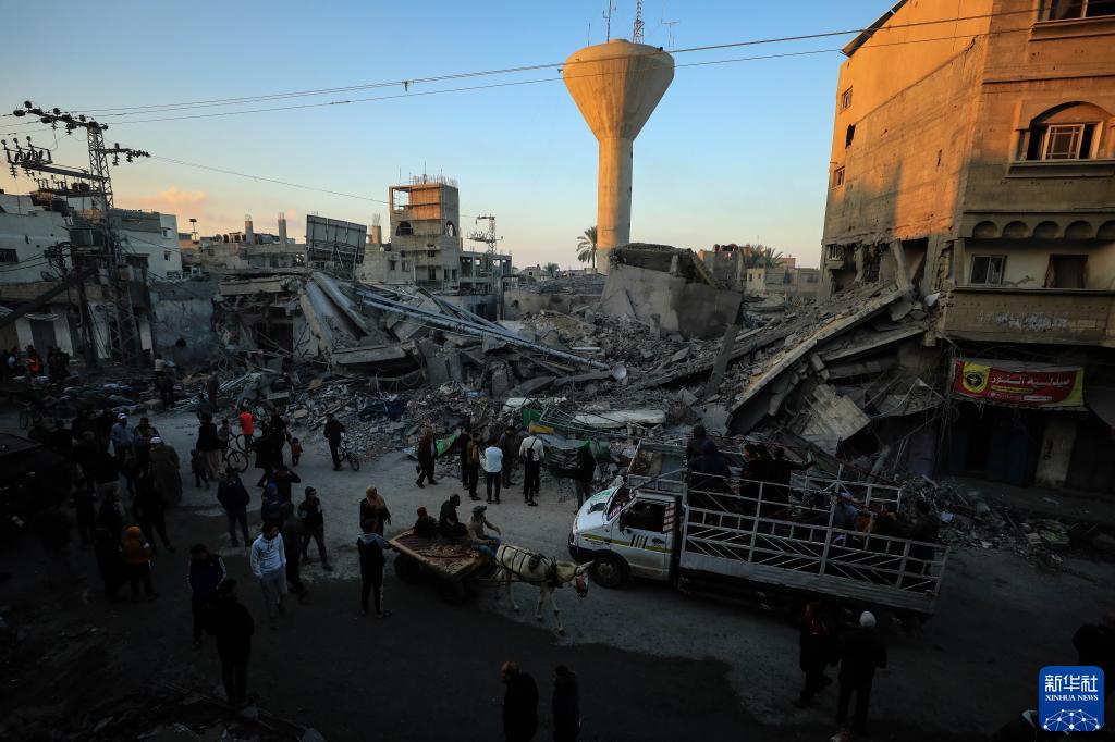 11月17日,在加沙地带南部城市汗尤尼斯,人们查看遭以色列袭击后的建筑废墟。