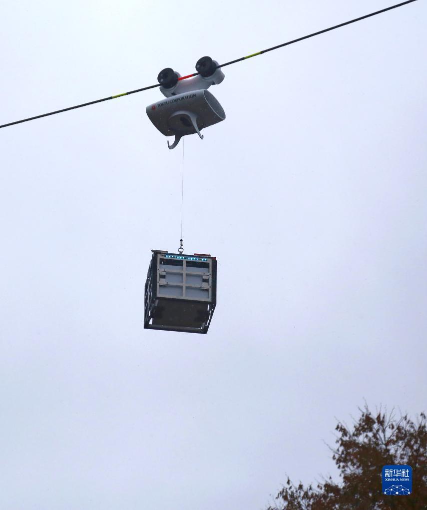11月17日,在日本川崎市,空中索道机器人在面向媒体的试验说明会上演示投递商品。
