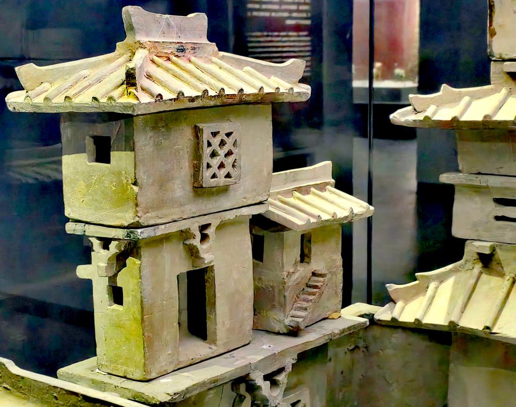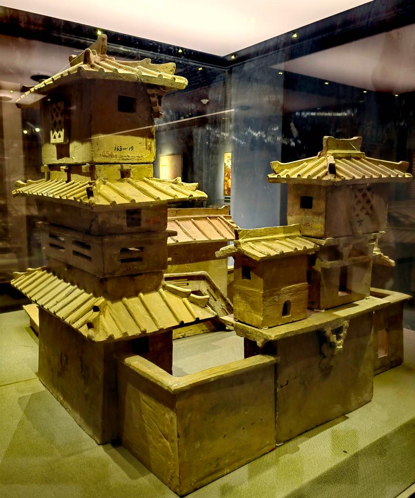 汉中市勉县博物馆的“镇馆之宝”东汉灰陶四合院建筑模型,1978年出土于勉县老道寺镇沙家庄村。这套模型分为主体庭院和偏院两大部分,主房、闺房、粮仓、禽圈等一应俱全,功能完善,且设计合理,是研究我国东汉时期建筑形制的稀有标本。