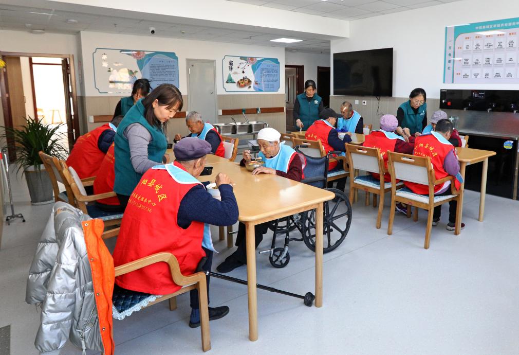 2023年11月18日,中阳县城区幸福养老服务中心老年人在就餐。张旭盛 摄