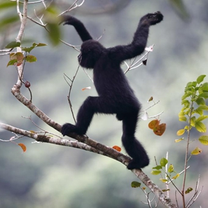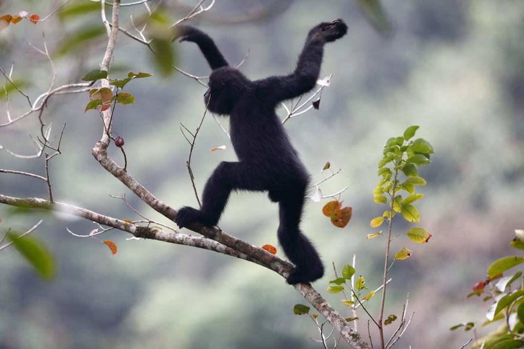 直立行走的东黑冠长臂猿在树冠上来去自如。(黄蒿和 摄)
