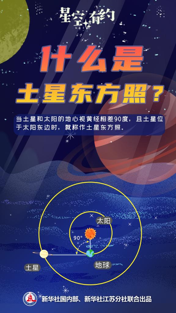 当土星和太阳的地心视黄经相差90度,且土星位于太阳东边时,就称作土星东方照。如果可以俯视太阳系的平面,此时你会看到太阳、地球、土星形成了一个直角,地球处于直角的顶点。