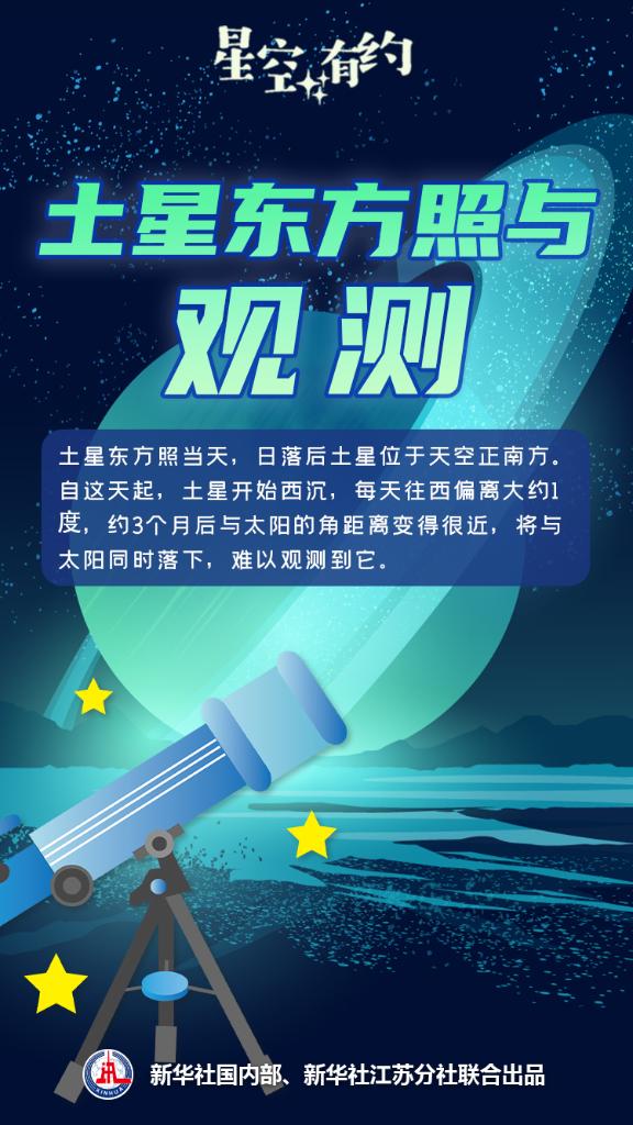 新华社南京11月21日电(记者王珏玢、邱冰清)11月23日17时47分迎来土星东方照,届时土星将位于天空正南方。土星东方照后的一段时间,土星观赏条件会逐渐变差,直至完全不可见。到下一次冲日前后,又迎来下一个土星观赏的最佳时机。什么是土星东方照?它和土星冲日时看到的土星有什么区别?天文科普专家为您揭秘。