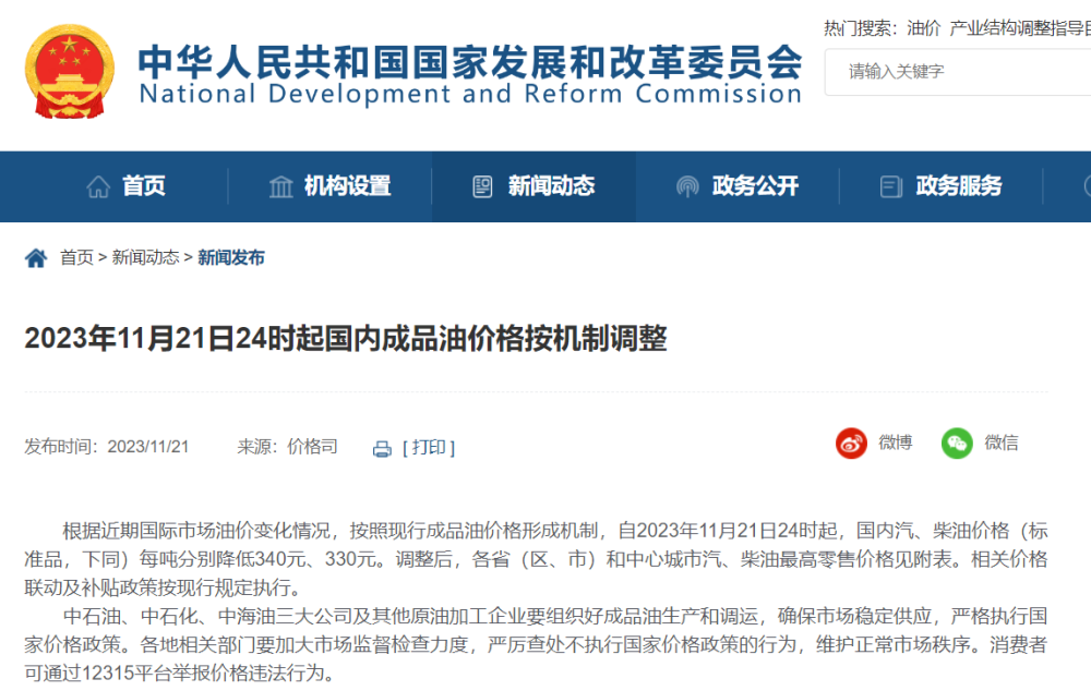 根据近期国际市场油价变化情况,按照现行成品油价格形成机制,自2023年11月21日24时起,国内汽、柴油价格(标准品,下同)每吨分别降低340元、330元。调整后,各省(区、市)和中心城市汽、柴油最高零售价格见附表。相关价格联动及补贴政策按现行规定执行。