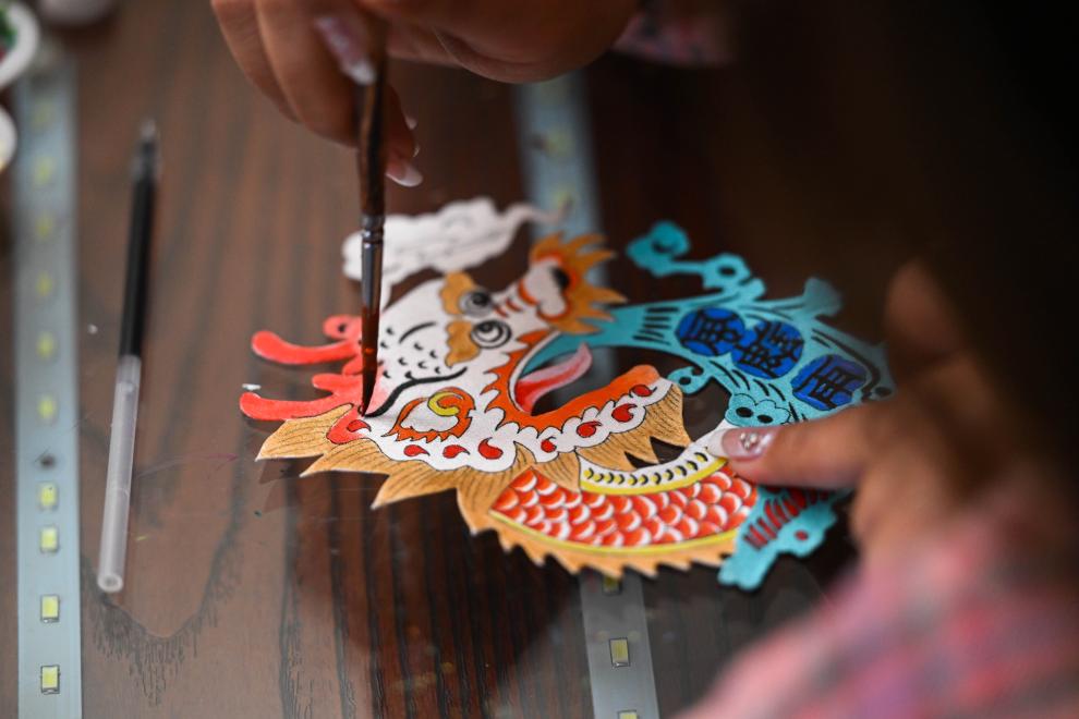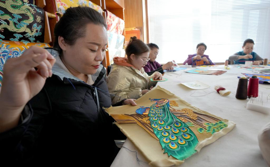11月16日,在内蒙古阿拉善盟阿拉善左旗的马鬃绕线蒙古族唐卡传习所,一名学徒在制作蒙古族唐卡。