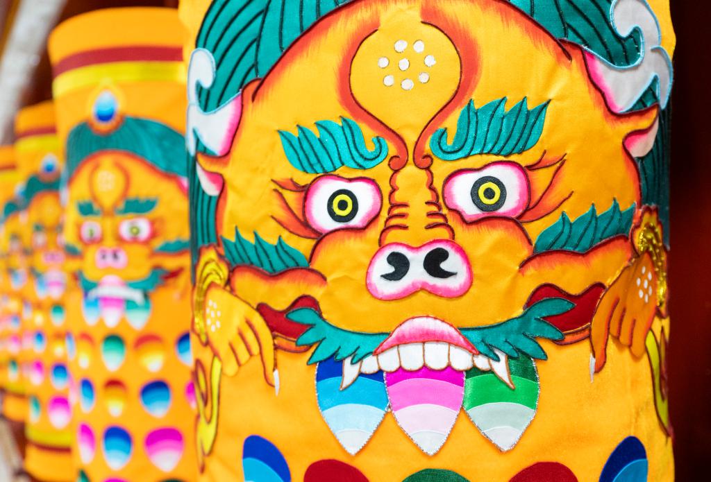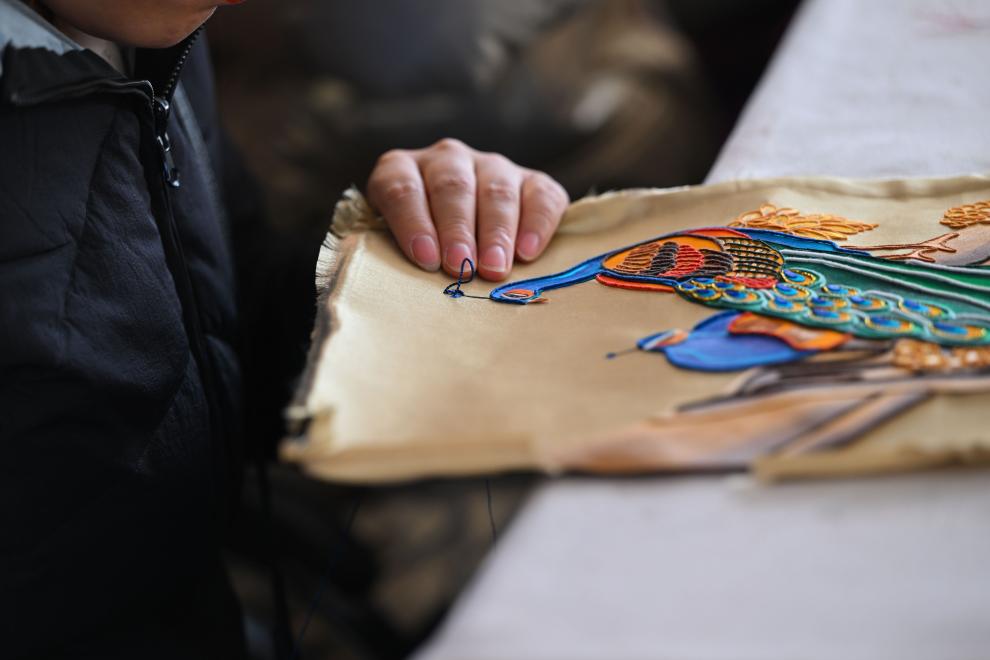 马鬃绕线、堆绣、上色……经过多道工序,一幅色彩丰富、立体感强的蒙古族唐卡作品才能制作完成。