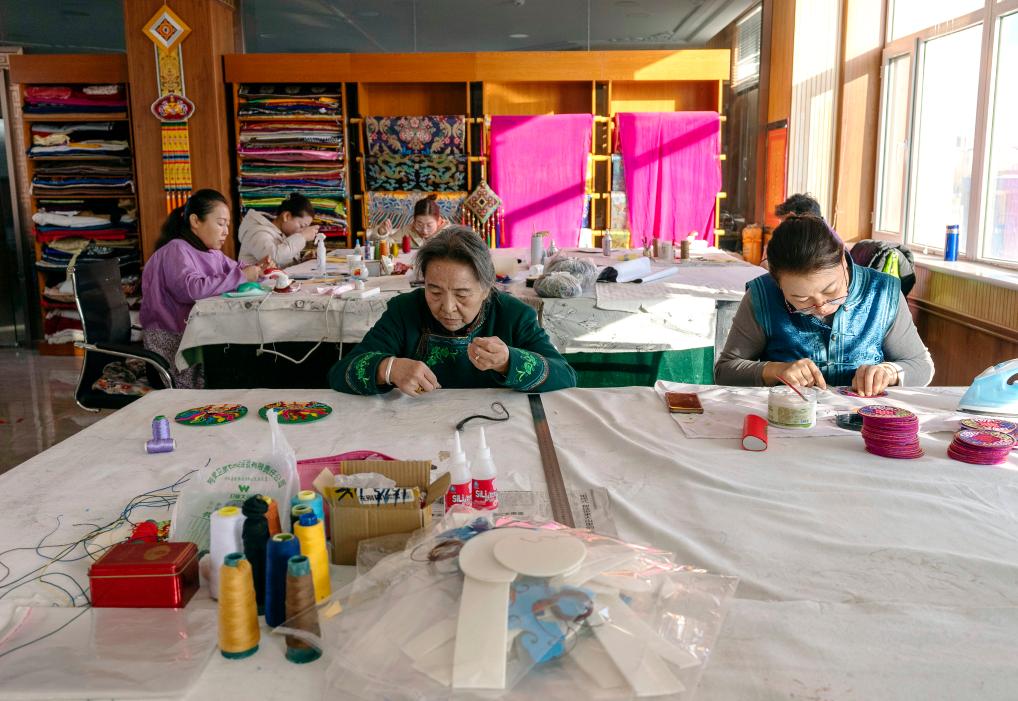 11月16日,陶格日勒(前左)与学徒们一起制作蒙古族唐卡。