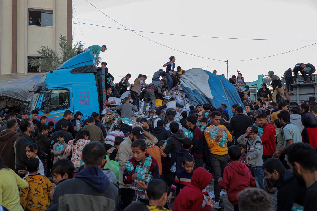 11月21日,在加沙地带南部城市汗尤尼斯,民众领取饮用水。新华社发(里泽克·阿卜杜勒贾瓦德摄)