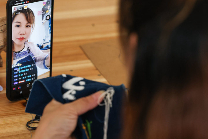 在贵州省黔东南苗族侗族自治州榕江县特和社区“母亲回家手工坊直播中心”内,主播在直播刺绣技艺。新华社记者 欧东衢 摄