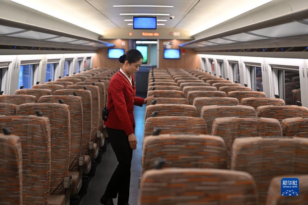 11月23日,客运员在运行试验车的车厢内巡查。