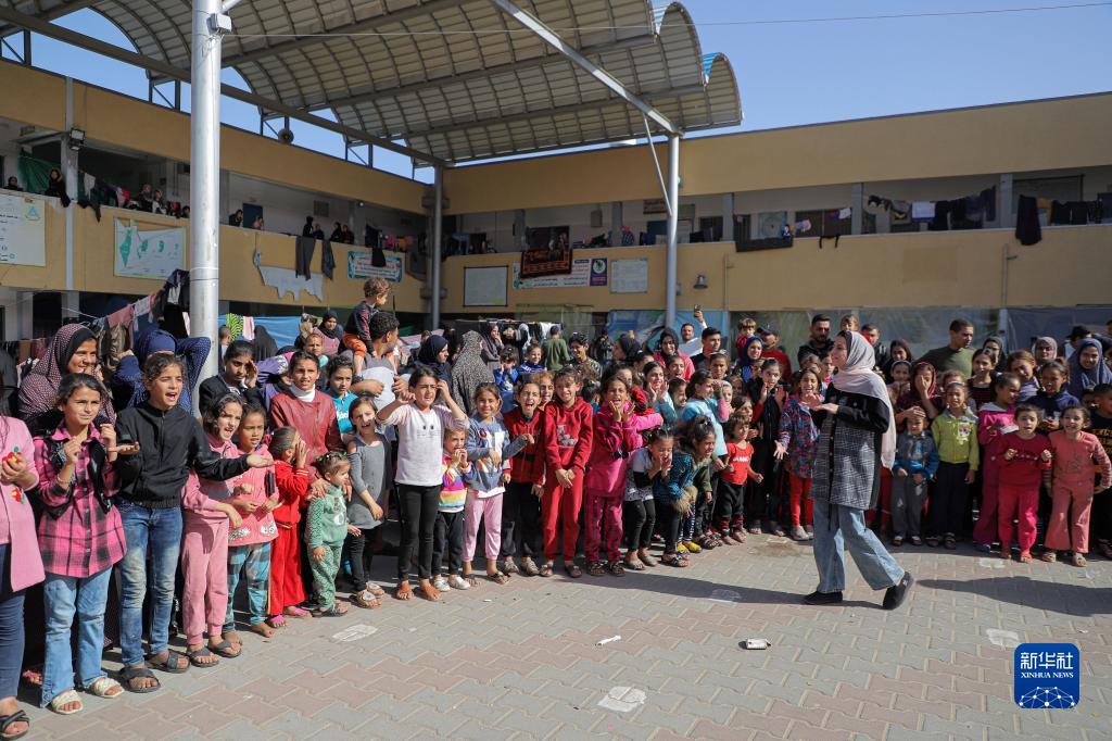 11月23日,在加沙地带南部城市汗尤尼斯,当地志愿者和儿童进行互动。