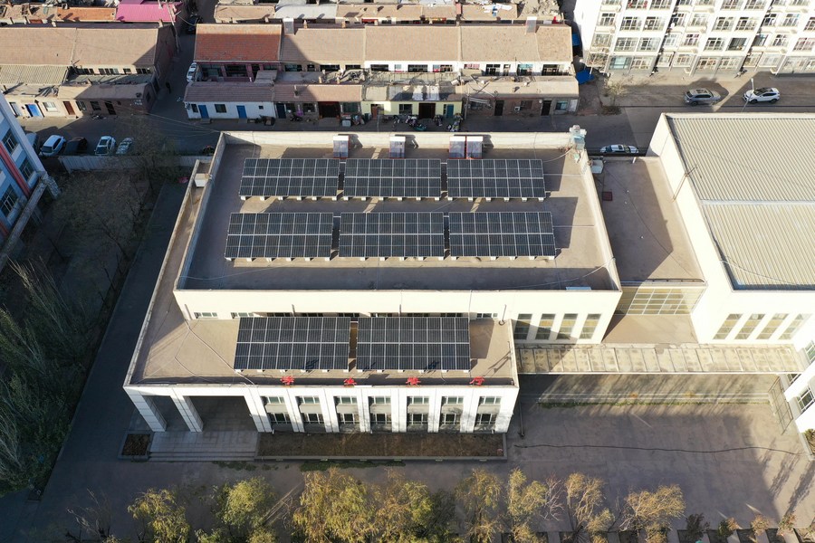 这是11月16日拍摄的位于内蒙古自治区乌海市海勃湾区的乌海市第八中学餐厅屋顶的光伏板(无人机照片)。新华社记者 李志鹏 摄