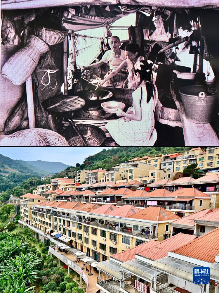拼版照片:上图为20世纪80年代福建宁德地区的连家船民生活场景(资料照片);下图为2023年11月15日拍摄的下岐村(新华社记者姜克红摄)。