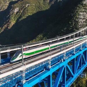 图为11月9日,丽香铁路动态检测期间,复兴号列车驶过虎跳峡金沙江铁路大桥。(中国铁路昆明局集团公司供图)