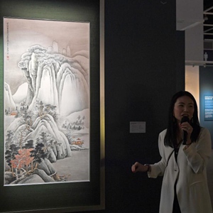11月24日,在香港会议展览中心,导赏员讲解张大千作品《关山密雪图》。新华社记者 陈铎 摄