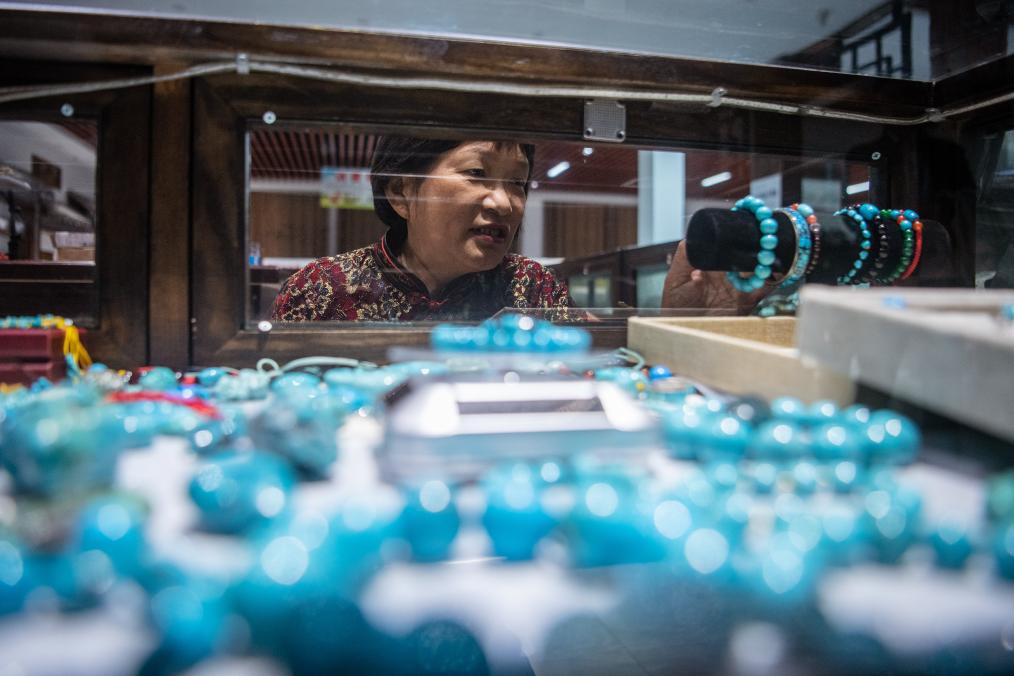 10月11日,湖北省郧西县下营村村民郭明凤在介绍自己展销柜台内的绿松石制品。新华社记者伍志尊 摄