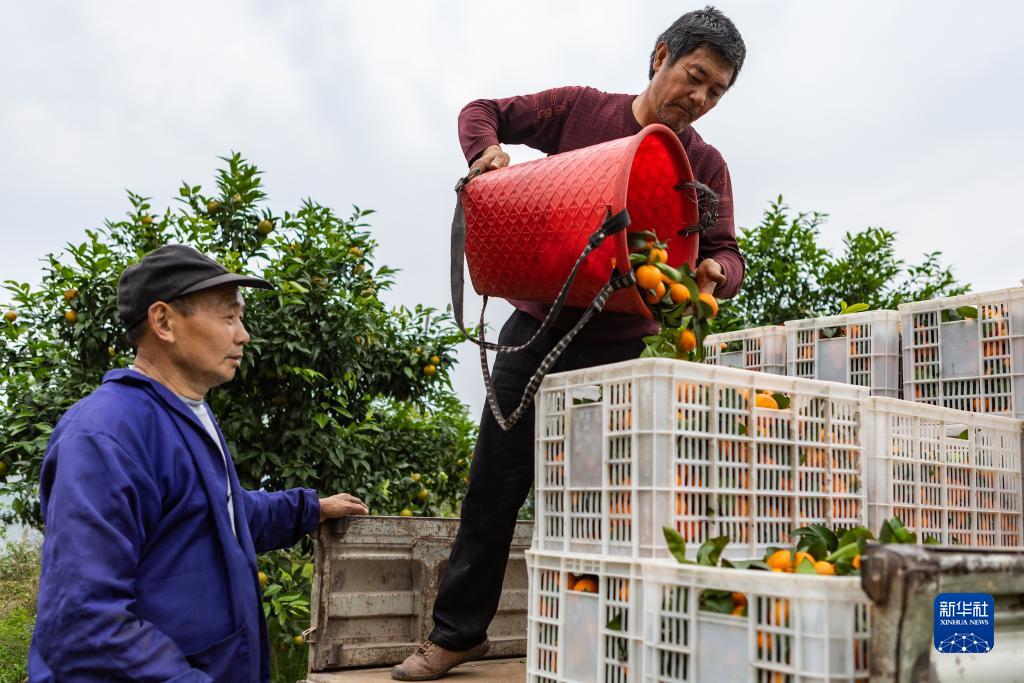 11月24日,在重庆市开州区竹溪镇大海村的一个柑橘种植基地,村民在将采摘的砂糖橘装箱。