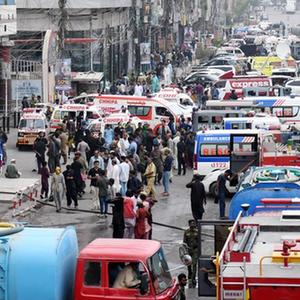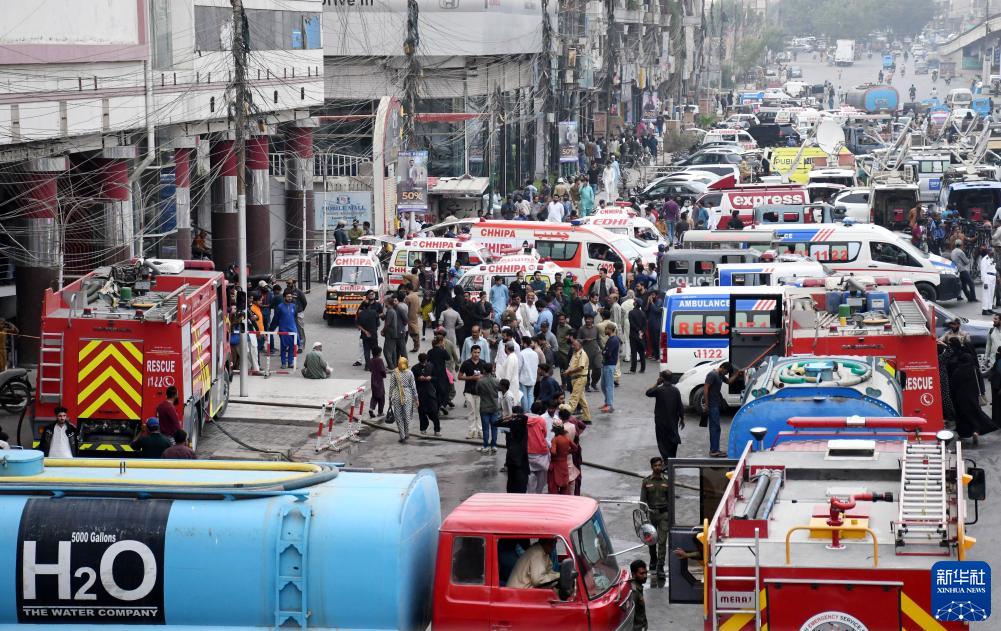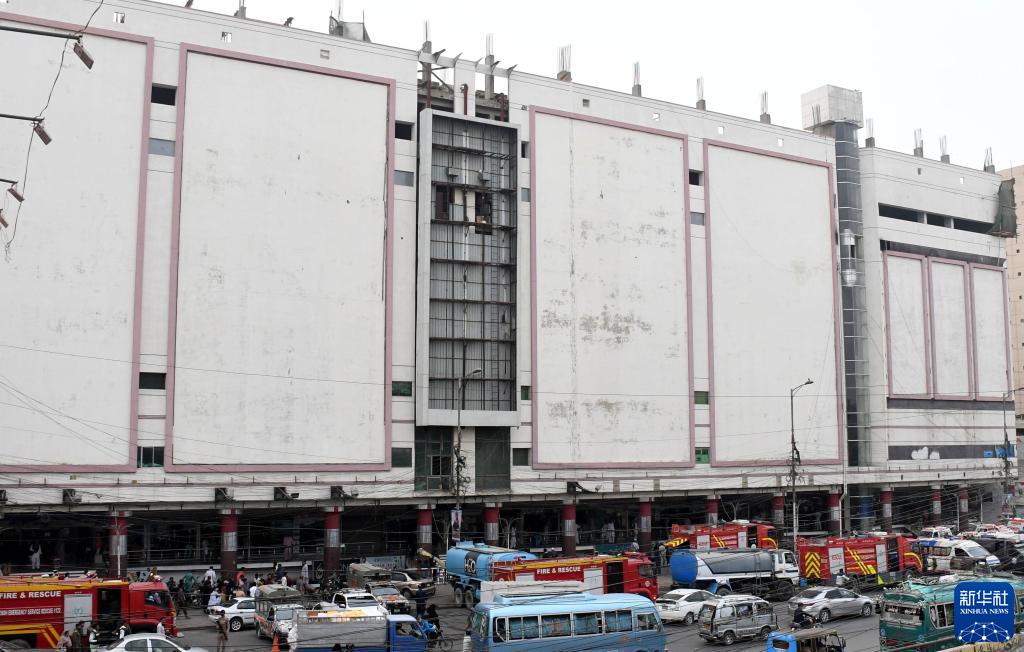11月25日,在巴基斯坦卡拉奇,应急车辆停在发生火灾的商场外。 新华社发
