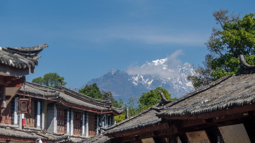 丽江古城的飞檐翘角和玉龙雪山相互掩映(资料照片)。新华社记者 胡超 摄
