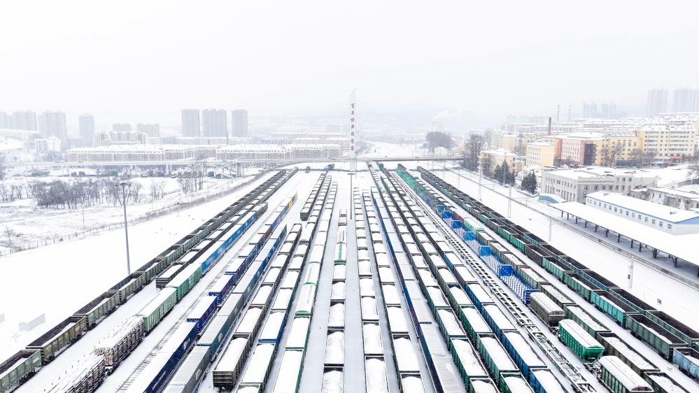 近日,“百年口岸”绥芬河银装素裹。虽然天寒地冻,但绥芬河铁路口岸货运现场吊机轰鸣、货箱起落,一列列中欧班列往来穿梭,呈现一派繁忙景象。记者从中国铁路哈尔滨局集团有限公司获悉,今年以来,中欧班列东通道绥芬河、同江铁路口岸班列数量持续保持高位运行。