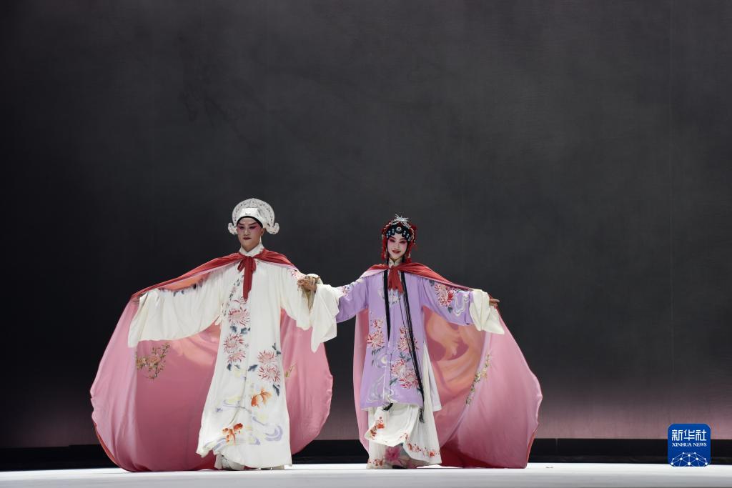11月24日,饰演柳梦梅的张军(左)与饰演杜丽娘的单雯谢幕。新华社记者 刘斐 摄