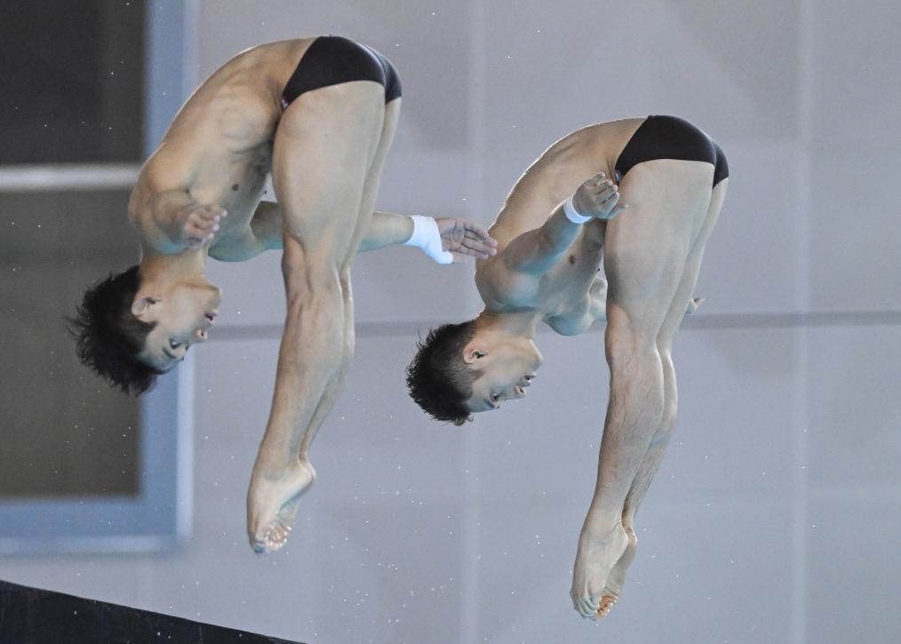 11月27日,陕西浩沙队选手杨昊(左)/山东洲克队选手练俊杰在男子双人10米台决赛中夺冠。新华社记者程敏摄