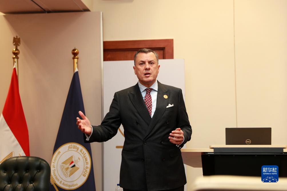 11月26日,埃及旅游和文物部长艾哈迈德·伊萨在埃及新行政首都举行的记者会上介绍本国旅游发展情况。新华社记者 隋先凯 摄