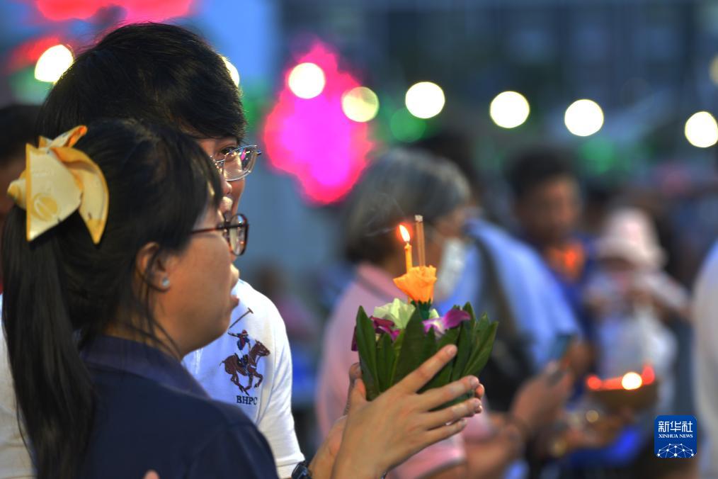 当日是泰国传统节日水灯节,泰国民众前往河流沿岸施放水灯,许愿祈福。