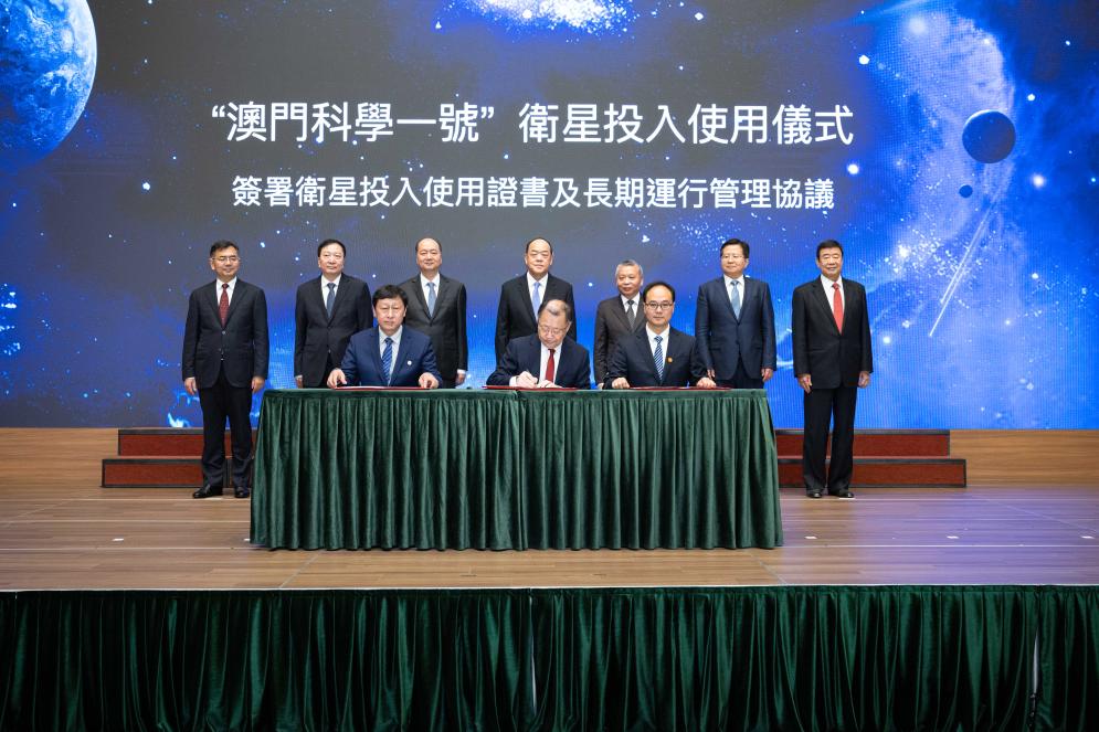 这是11月28日拍摄的“澳门科学一号”卫星投入使用证书、长期运行管理协议签署仪式。新华社记者 张金加 摄