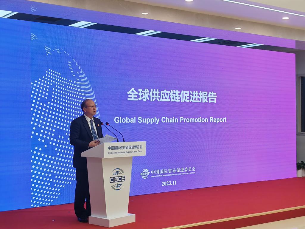 在11月28日举行的贸促智库论坛暨《全球供应链促进报告》发布会上,中国贸促会副会长陈建安介绍该报告有关情况。新华社记者潘洁 摄