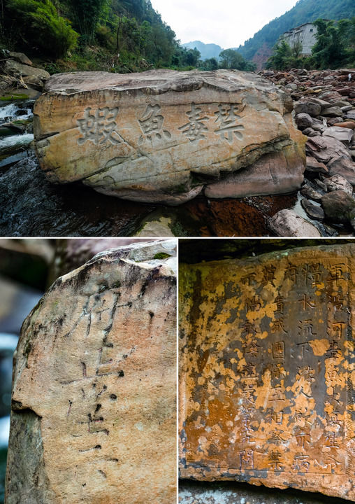 初冬时节的赤水支流桂花河水流平缓,顺着水稻田坎下到岸边,一块镌刻着“禁毒鱼虾”四个正楷大字的巨石立于河畔,左上角款识题作“府正堂示”。“正堂”,是清代主官的代称。这样的碑刻在黄荆镇还有两处。“沿河毒鱼大伤生命,水流下游人饮亦病。”朴素的文字道出了黄荆老林先民们的“环保意识”。