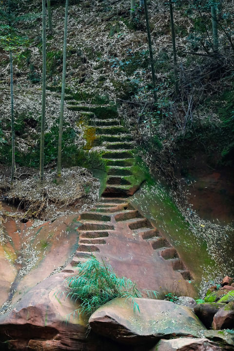 碑刻下游,依山开凿的茶盐古道仍清晰可辨,红砂岩上覆满青苔,马铃声声犹在耳畔。
